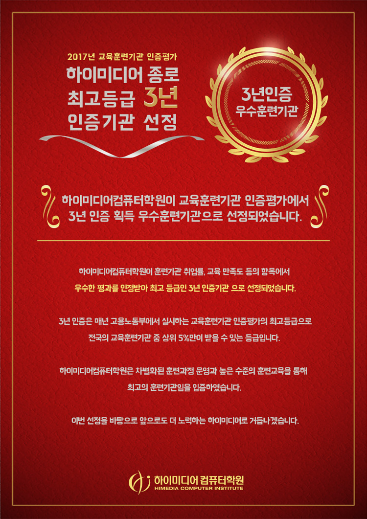 [종로]2017년 고용노동부 우수훈련기관 선정 3년인증 획득